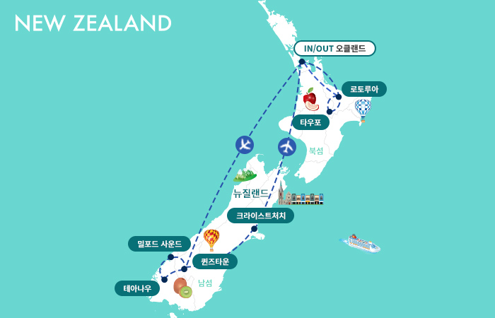 - 뉴질랜드 여름은 낮에는 여행하기 좋은 날씨이나 아침/저녁으로는 일교차가 크며, 남섬은 초겨울 처럼 추울 수 있으니 보온에 대비하여 따뜻한 점퍼를 반드시 준비 바랍니다.