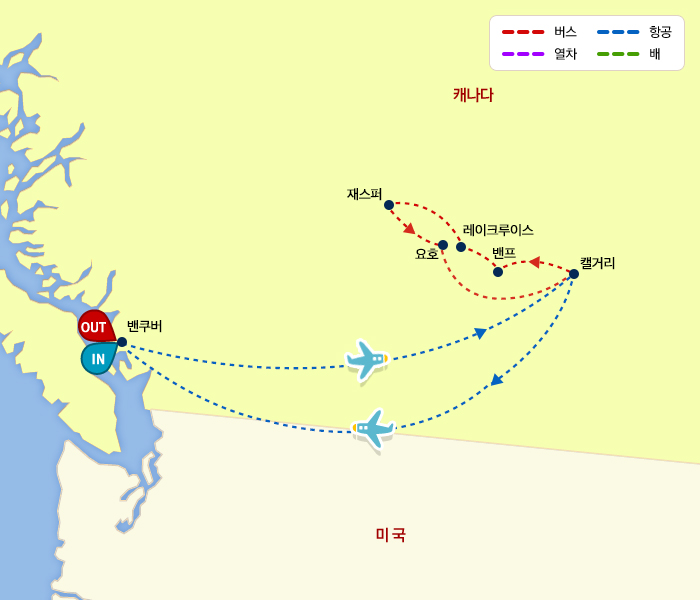 인천-밴쿠버(1)-캘거리/밴프(1)-레이크루이스/밴프(1)-아이스필드/밴프(1)-요호/캔모어/캘거리(1)-밴쿠버(1)-인천