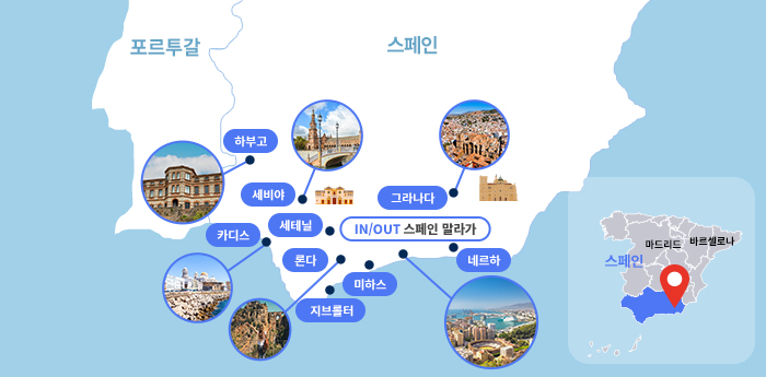 ☑ 피카소의 고향 말라가 - 피카소 미술관, 대성당, 알카사바 등 ☑ 이슬람 문화의 결정판 그라나다 - 알함브라, 헤네랄리페 정원, 그라나다 대성당☑ 절벽위에 자리한 투우의 고향 론다 - 투우장&박물관, 누에보다리☑ 바위 아래 숨겨진 독특한 마을 세테닐 ☑ 오페라 "세비야의 이발사" 배경인 세비야 - 대성당, 스페인 광장, 마리아루이사 공원 등 ☑ 하몽의 성지 하부고 - 하몽 생산장 방문 ☑ 스페인을 대표하는 올리브 농장 방문 ☑ 이베리아 반도 끝, 영국의 해외 영토 지브롤터 ☑ 하얀 마을 미하스 ☑ 유럽여행의 꽃 아울렛(맥아더글렌)