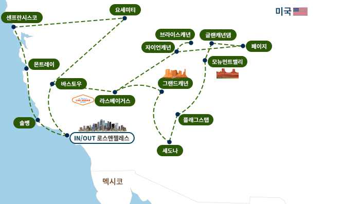 인천 - 로스엔젤레스(1) - 바스토우/라스베가스(1) - 브라이스캐년/자이언캐년/페이지(1) - 글랜캐년댐/모뉴먼트밸리/플래그스탭/세도나(1) - 그랜드캐년/라스베가스(1) - 바스토우/프레즈노(1) - 요세미티/샌프란시스코 인근(1) - 샌프란시스코 시내/샌프란시스코 인근(1) - 몬트레이/솔뱅/로스엔젤레스(1) - 인천