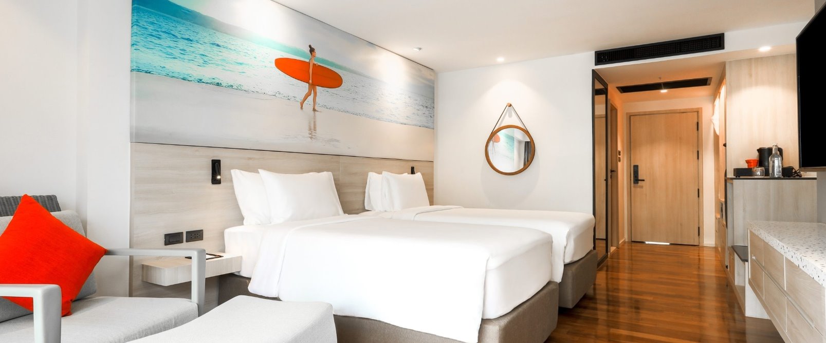 【 레디슨 레드 (Radisson RED Phuket Patong Beach) 】☞ 24년 연말에 오픈한 신상호텔! 『 스탠다드 객실』 투숙☞ 최대 번화가인 파통비치까지 걸어서 5분거리에 위치해 있으며, 12분 거리에는 방라로드가 있어 뚜벅이들도 이동하기 편한 최적의 위치!☞ 헬스장, 4개의 레스토랑, 2개의 바 및 키즈클럽까지! 다양한 부대시설 이용 가능