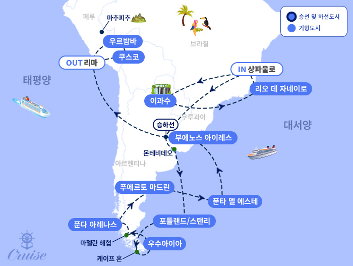 인천-경유도시-상파울로 ▷ 이과수(브라질)/이과주(아르헨티나) ▷ 리오데자네이로(브라질) ▷ 상파울로-부에노스아이레스(아르헨티나) 승선 ▶ 몬테비데오(우루과이) ▶ 포트 스탠리/포클랜드제도 ▶ 케이프혼(칠레/해상) ▶ 우수아이아(아르헨티나) ▶ 마젤란해협(해상) ▶ 푼타 아레나스(칠레) ▶ 푸에르토 마드린(아르헨티나) ▶ 푼타 델 에스테(우루과이) ▶ 부에노스아이레스(아르헨티나) 하선 - 리마/쿠스코(페루) ▷우루밤바/마추픽추 ▷ 쿠스코-리마-경유도시-인천