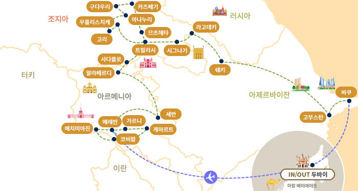 인천-두바이(1)-(항공)-바쿠(1)-고부스탄-쉐키(1)-라고데키-시그나기-트빌리시(2)-우플리스치케-고리-아나누리-구다우리(1)-카즈베기-므츠헤타-트빌리시(1)-사다클로-알라베르디-세반-예레반(1)-게하르트-가르니-예레반(1)-코비랍-예치미아진-예레반(1)-(항공)-두바이-기내(1)-인천
